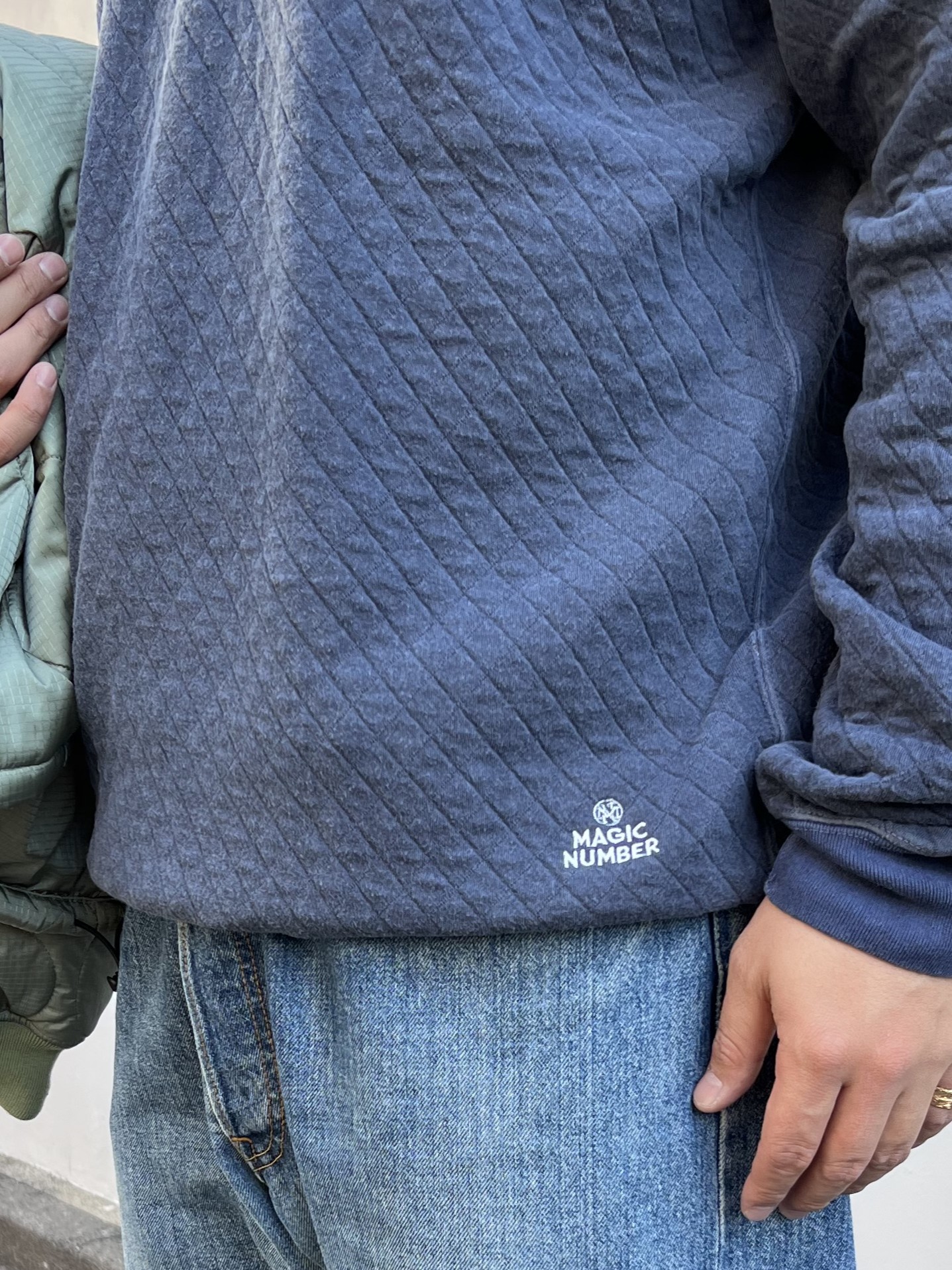 MAGIC NUMBER×Good OnのLS QUILT RAGLAN CREWは、独特のキルティングデザインが存在感を放つ一枚。