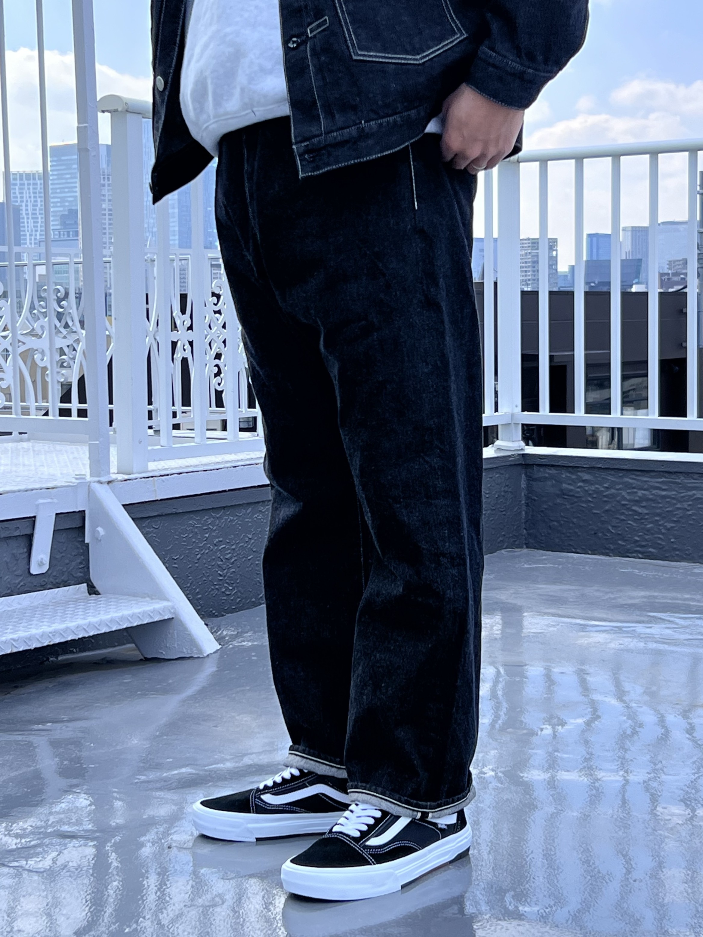 上質なデニム特有のハリと濃色の美しい表情が際立ち、そこにVANSのサイドストライプとホワイトソールが程よいコントラストを生み出します。