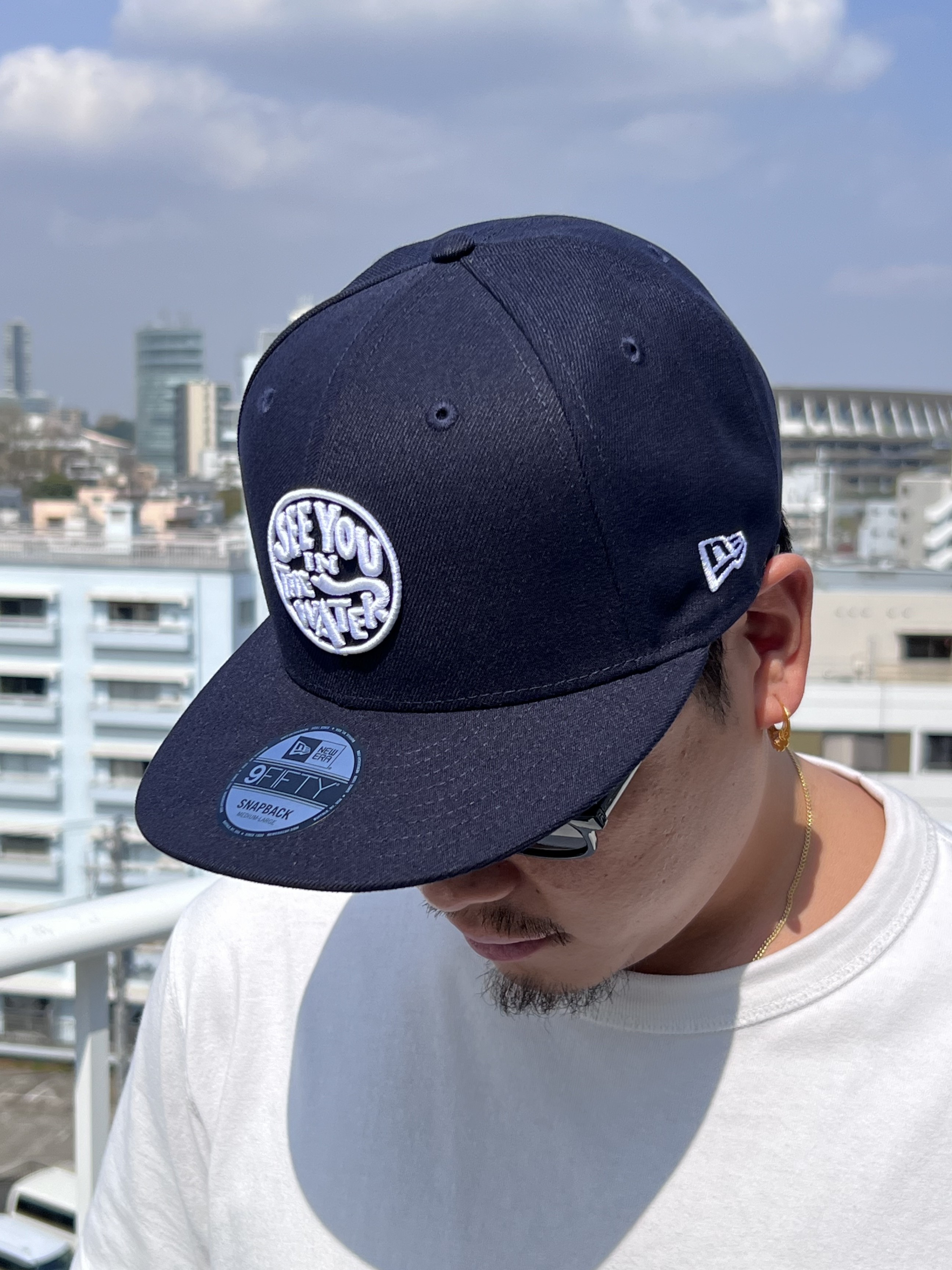 落ち着いたネイビーが全体のトーンを引き締めつつ、ツバ裏のブラウンや「SEE YOU IN THE WATER」の刺繍がさりげない個性を添えてくれます。