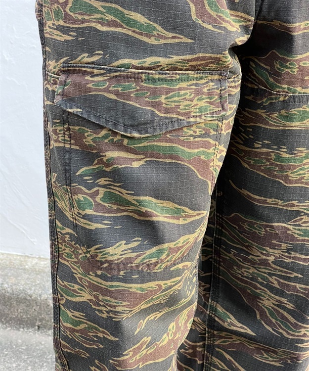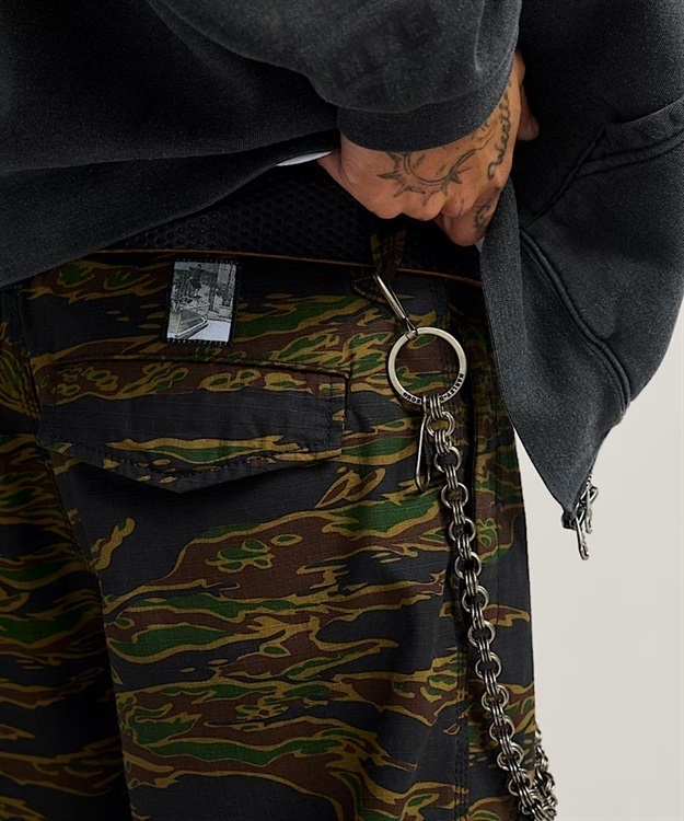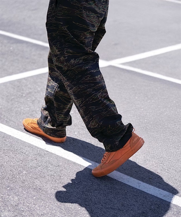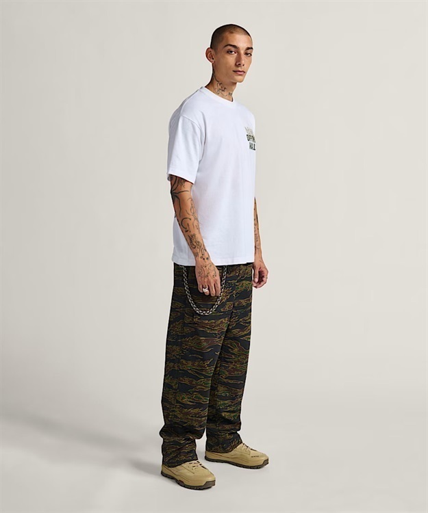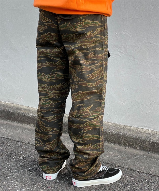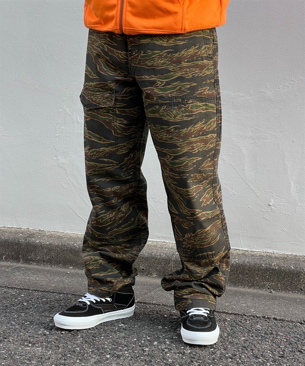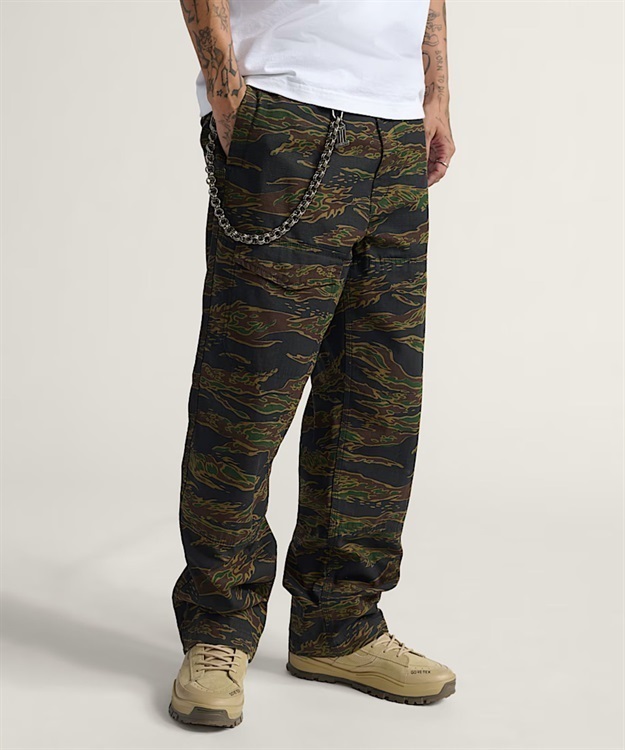 ヴィンテージ ウォッシュを施したカスタム タイガー カモ カーゴ パンツが時代を超越した魅力を加え、破れにくくするように設計された生地のよりタイトな織りによるリップストップ加工。強化された膝はハードな作業にも安全であり、たくさんのカーゴポケットによりスケート中に荷物を簡単に収納できます。
