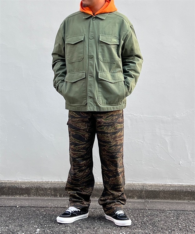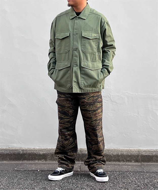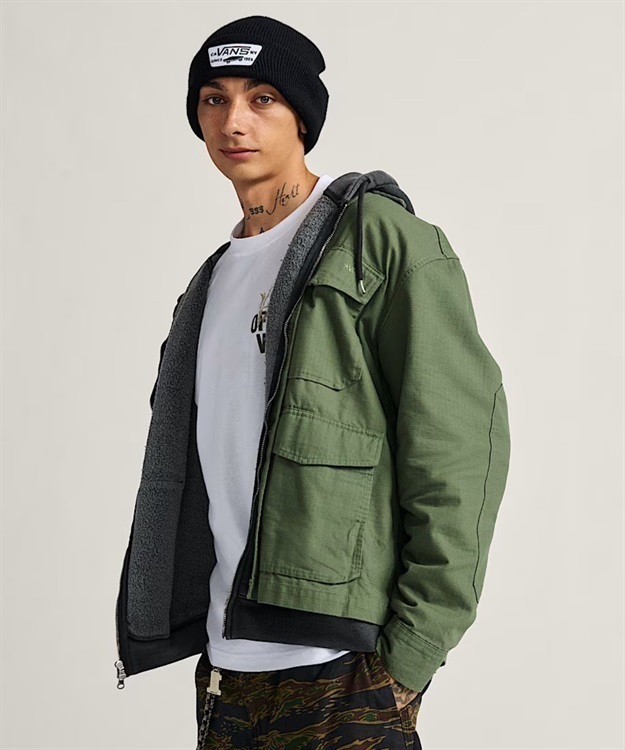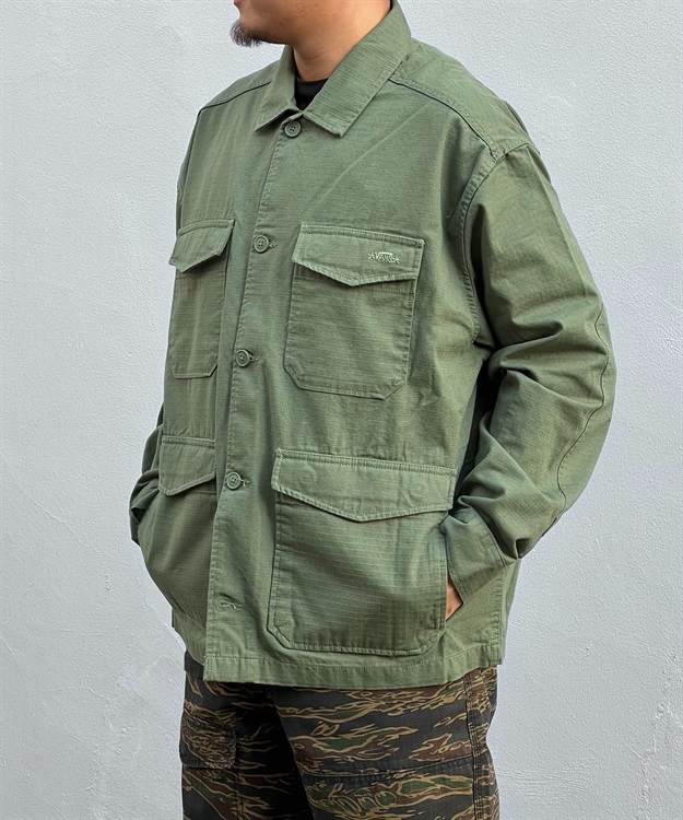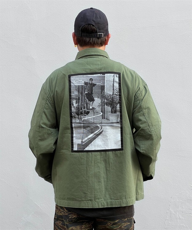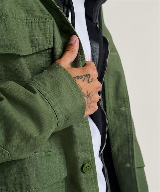 ミリタリー オーバーシャツはスケートパーク用に作られており、耐久性のあるリップストップ加工と、重ね着やソロ着用の快適なスタイルを兼ね備える。