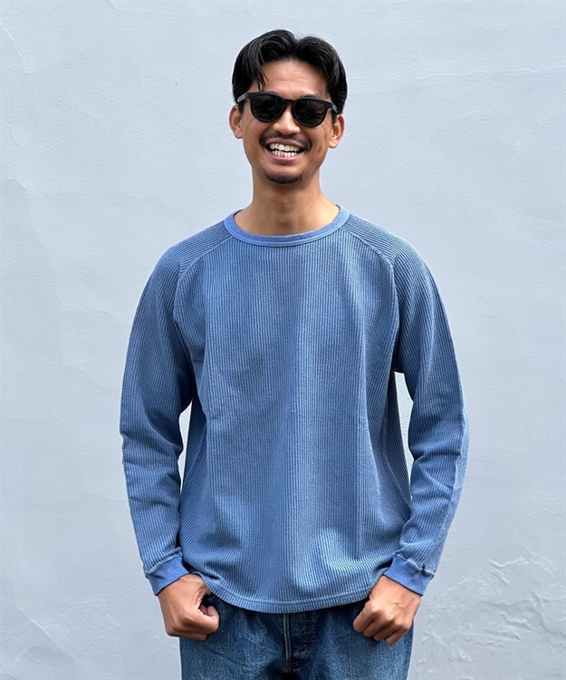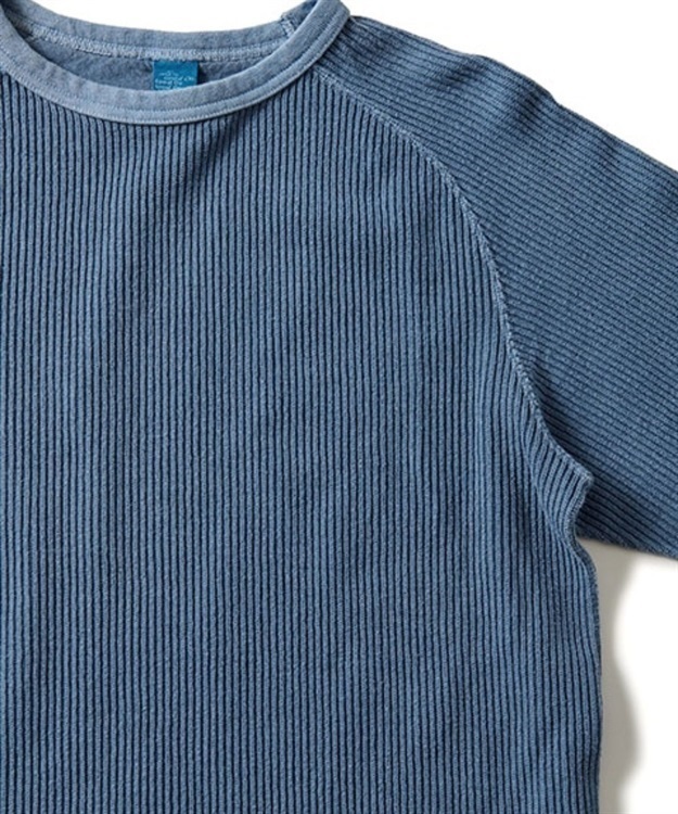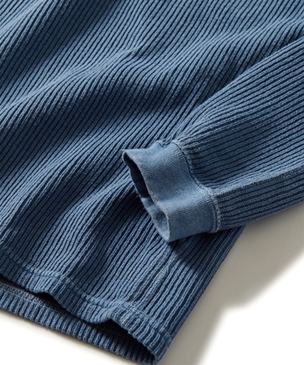 ざっくりとした細畝のニットをPigment Dye(顔料染め)することにより、一見コーデュロイのような風合い感のある表情に仕上がっており、洗濯を繰り返すことで徐々に色褪せしていき、ビンテージ品のような味のある雰囲気へと変化していきます。