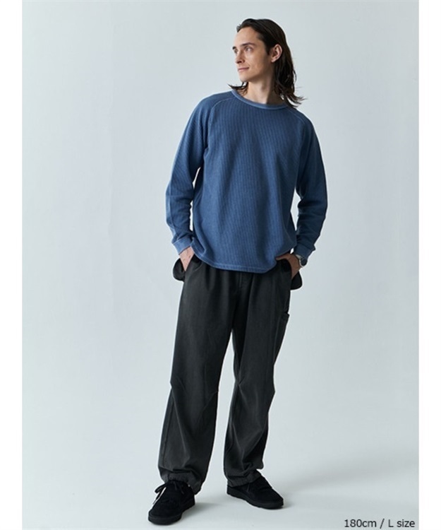 ※製品染め商品の特性上、染め上がりのお色やサイズに若干の個体差がございますので予めご了承ください。また、独特のユーズド感のある表情、多少のゆがみや擦れ、縫い目部分のしわ、編み地の筋やムラなどは製品の特徴です。特有の不均一感やラフ感をお楽しみください。