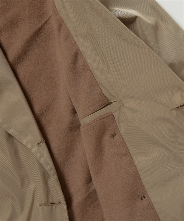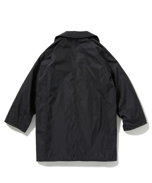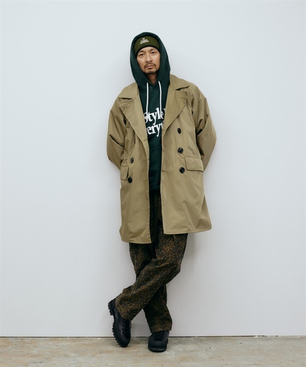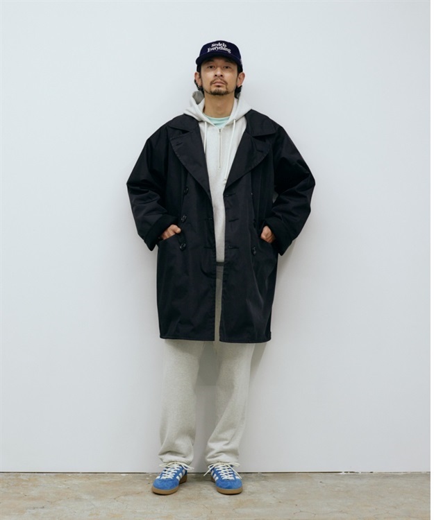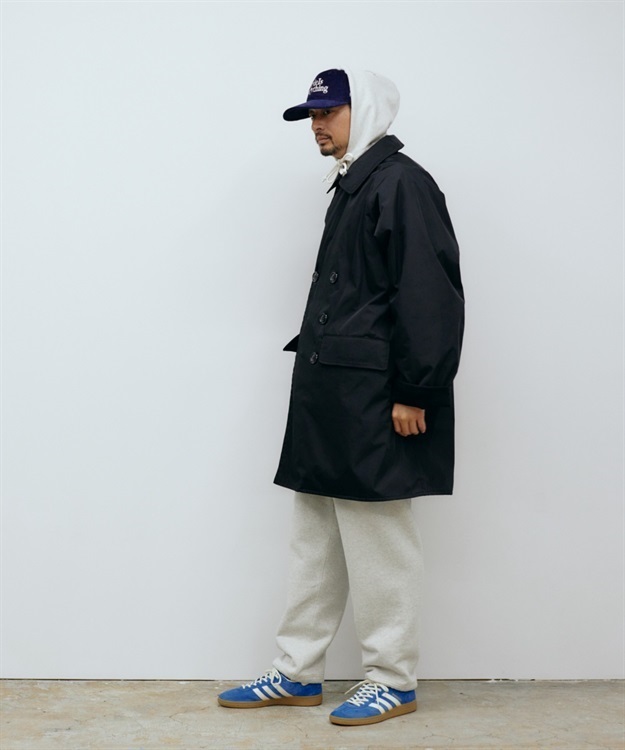 肉厚でシワになりにくいポリエステルツイルと保温性が高いモールスキン素材を使用。 オン、オフ問わず着用可能な一着です。 ・トレンチコートやPコートに見られる大きめの襟 ・肩のラインを綺麗に見せるラグランスリーブ ・襟にコシを出す襟裏ダイヤモンドステッチと細かいステッチの台襟 ・強風などのシチュエーションに合わせ右前でも左前でも着用可能 ・グローブのままでも握りやすい大きめのフロントボタン ・前身頃両裏に片玉縁ポケットを配置 ・身幅、裾幅、袖幅にゆとりを持たせた現代 的なシルエット ・フラップポケット LOGO刺繍