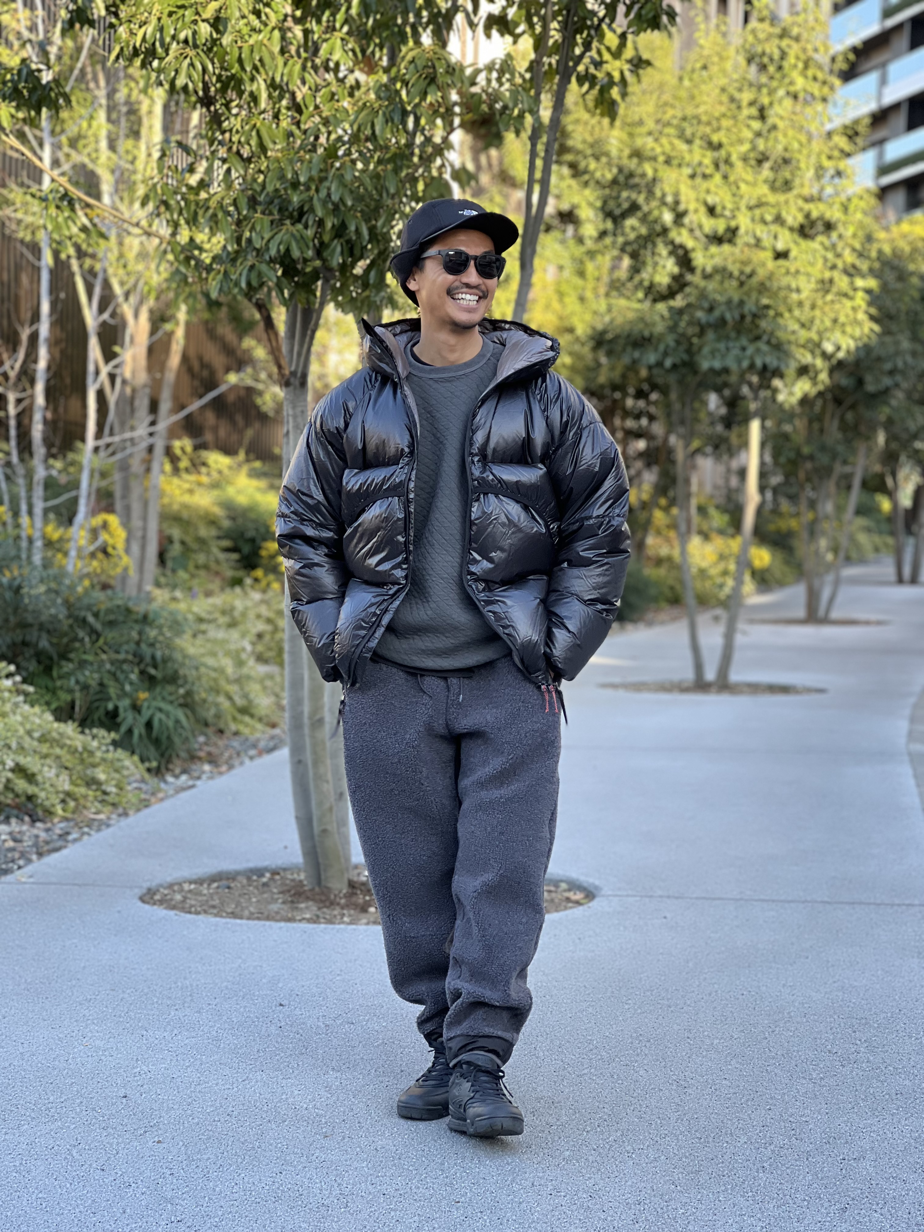ブラックダウンの光沢と白スウェットの柔らかさ。